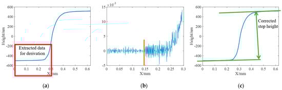 Tilt−correction process: (a) step height profile, (b) first-order derivative height, (c) corrected step height profile.