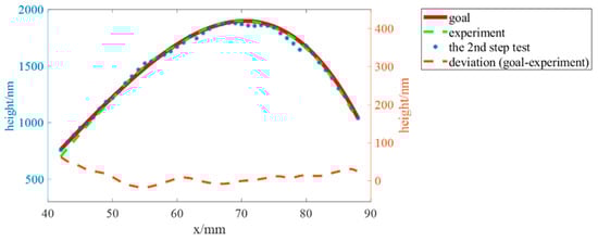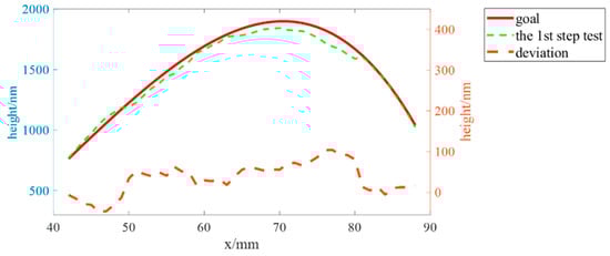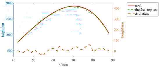 Under the same experimental conditions as before, the second film thickness calibration experiment was carried out with the trimmed mask. The step height profile was found to be closer to the target profile than the first calibration result. The film thickness distribution test results are shown in Figure 15, with a thickness error of less than 62 nm. Compared with the first film thickness calibration, the maximum film thickness error was reduced by 43 nm, and the figure error was 21.2 nm RMS, reduced by 17.7 nm RMS.