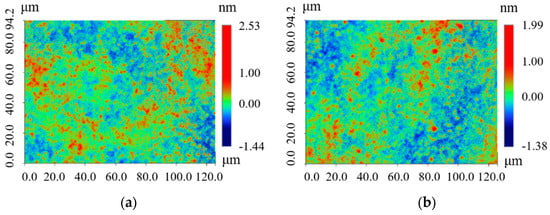 In addition, to study the roughness change after coating, a zerodur substrate was used to deposit silicon film at a depth of 2000 nm. The roughness values of the surface before and after coating based on the data obtained using the optical profiler (50×) are shown in Figure 16. It was found that the surface roughness values before and after the experiment were 0.308 and 0.334 nm RMS, respectively. Therefore, the surface roughness does not change significantly after coating.