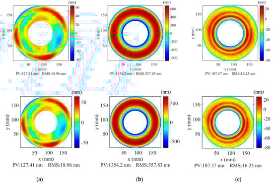 Finally, the surface of the mirror was coated with a silicon film, as shown in Figure 17. The surface was characterized using a Zygo (DynaFiz TM) interferometer. The test mode chosen is PSI (Phase-Shifting Interferometry) mode with 1200 × 1200 pixels. The reference mirror diameter is 100 mm. Repeatability error is typically 1.5 nm RMS. Thirty image frames were captured and averaged to improve measurement accuracy. Since the deviation between the hyperboloid and the sphere is relatively small and within the measurement range of the interferometer, it can be considered as the difference between the two surfaces. The measurement results revealed a significant change in the rotational symmetry of the surface topography. Figure 18a,b shows the surface topography of the spherical mirror before and after coating. Compared with the correction-amount distribution in Figure 2b, the residual surface error of 42–88 mm in the radial direction was 16.23 nm RMS without the initial surface error of the spherical mirror, as shown in Figure 18c.