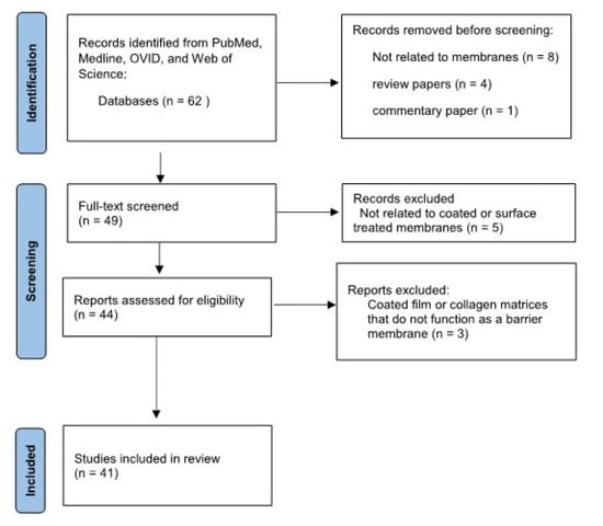 A literature search was performed in electronic databases, including PubMed, Medline, OVID, and Web of Science, by using the following keywords: “membranes”, “guided bone regeneration”, “guided tissue regeneration”, “coated”, and “coating” from 2017 January to 2022 June. Documents written in English were selected. Sixty-two papers were found and among them, a total of 41 papers were included in this study, excluding 21 papers not related to coated membranes or review papers (Figure 1). Based on the selected 41 papers, we would like to briefly review the membrane coating materials studied so far (Table 1).