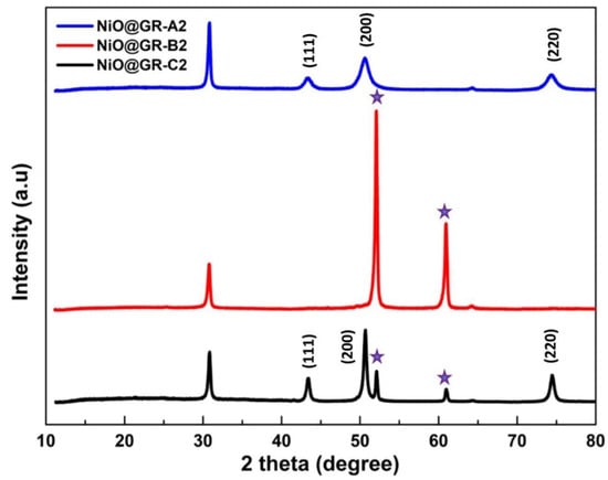 XRD patterns for NiOx@GR-A2, NiOx@GR-B2, and NiOx@GR-C2.