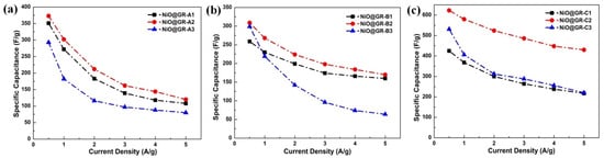 Specific capacitance of the NiOx@GR nanocomposites at different current densities: (a) NiOx@GR-A1, NiOx@GR-A2, and NiOx@GR-A3; (b) NiOx@GR-B1, NiOx@GR-B2, and NiOx@GR-B3; and (c) NiOx@GR-C1, NiOx@GR-C2, and NiOx@GR-C3.