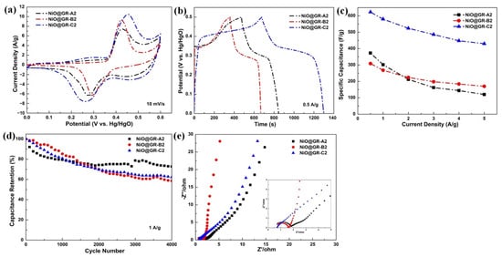 When comparing the electrochemical performance of the NiOx@GR nanocomposites prepared using the different metal precursors under the optimal ratio (NiOx@GR-A2, NiOx@GR-B2, and NiOx@GR-C2), NiOx@GR-C2 exhibited the highest specific capacitance, corresponding to the largest integral area in the CV curves and the longest discharge time in the GCD curves at the same scan rate and current density (Figure 4a–c). This composite might benefit from the small particles and fluffy surface of the metal oxide increasing the surface area, which can boost the exposed active sites, facilitating contact with electrolytes, and the porous structure, which provides more pathways for ion transport, consequently promoting the faraday reaction. The effects of the metal precursors on the cyclic stability of the composite were also investigated at the current density of 1 A/g (Figure 4d). It can be seen that the capacitance retentions were 72.8%, 58.6%, and 62.2% for NiOx@GR-A2, NiOx@GR-B2, and NiOx@GR-C2, respectively, after 4000 cycles in each case. The relatively high capacitance retention might be due to the synergistic effect between the graphene and the metal oxide, which benefited from the buffering of the mechanical stress during the charge–discharge processes and increased the redox efficiency [,]. Among the prepared composites, NiOx@GR-A2 presented with the highest cycle stability, which might be related to the bulk form and crumpled surface of the NiOx. Moreover, in Table 1, the electrochemical properties of NiOx@GR prepared through microwave heating are compared with previously reported approaches. It is obvious that the microwave heating method shortens the reaction times from hours to minutes and exhibits a higher specific capacitance. The improved capacitance of NiOx@GR may be attributed to the strong interaction between the NiOx and the graphene sheets, resulting in an enhanced charge transport [].