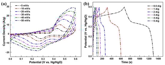 The electrochemical performance was investigated using galvanostatic charge–discharge (GCD), cyclic voltammetry (CV), and electrochemical impedance spectroscopy (EIS) tests in three electrode cells. The CV curves were measured at a potential window of 0–0.6 V under different scan rates (5–50 mV/s), and GCD tests were conducted at a potential of 0–0.5 V with different current densities (0.5–5 A/g). The EIS analysis was tested with an open-circuit voltage using an AC amplitude of 0.005 V in the frequency range of 10−1 to 105 Hz. The working electrode was fabricated by mixing together the active material, carbon black, and polyfluortetraethylene (PVDF) in an 80:10:10 weight ratio. Then, N,N-dimethylformamide (DMF) was added to the mixture as a solvent to form the homogeneous slurry, which was coated onto the pretreated nickel foam (1 × 1 cm2). The electrode was dried at 60 °C for 24 h under a pressure of 20 MPa, and the mass loading of the active material was about 2 mg/cm2. The Hg/HgO electrode and platinum sheet (1 × 1 cm2) were used as the reference electrode and counter electrode, respectively. The electrolyte was a 6.0 M KOH aqueous solution. The specific capacitance value was calculated from the GCD curves according to the following equation []:
