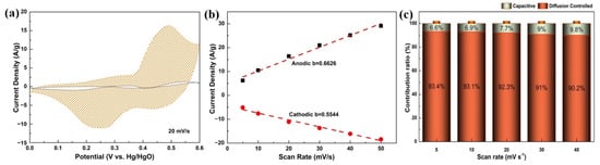 through plotting versus , the and can be determined. As shown in Figure 6b, the b values of the oxidation and reduction peaks were 0.6626 and 0.5544, respectively, suggesting that the charge storage of NiOx@GR-C2 benefited from both the diffusion-controlled contribution and capacitive effect. The capacitive current separated from the total measured currents under the scan rate of 20 mV/s is displayed in Figure 6a. The details of the capacitive effect and diffusion-controlled contribution at different scan rates are shown in Figure 6c. At 5 mV/s, the percentage of the diffusive mechanism contribution was 93.4%. As the scan rate decreased, the capacitive contribution increased, while the diffusive contribution increasingly depressed. This was due to the fact that the ions did not have enough time to intercalate inside the material structures. However, in this system, the percentage of the pseudocapacitance contribution still remained at 90.2% at 50 mV/s; thus, the pseudocapacitance contribution was believed to be dominative.
