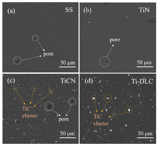 SEM images of the surfaces of (a) SS; (b) TiN; (c) TiCN; (d) Ti-DLC.