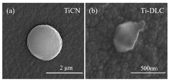 The surface morphologies of the films are shown in Figure 1. The surface of the SS substrate was basically smooth and flat, but there were some tiny pores with irregular shapes, which was mainly due to the cutting and polishing effect. After deposition, few pores were observed on the surfaces of the TiN and TiCN films, while some micro-sized TiC particles were observed. The Ti-DLC film exhibited the lowest porosity, but several flaky defects and clusters were observed on its surface. The adhesion of the three films to the substrate is firm [20]. The thicknesses of the TiN, TiCN, and Ti-DLC films were 2.05, 4.10, and 4.48 μm, respectively; further information about the film layer characteristics and properties can be obtained from previous studies [20]. The SEM images depicting the morphology of the TiC particles of TiCN and Ti-DLC are shown in Figure 2. The TiC particles in the TiCN film were nearly spherical, and their diameters were 1–2 μm; however, TiC clusters on the Ti-DLC films exhibited irregular shapes. Their diameters were in the sub-micrometer or nanometer range. The number of TiC clusters on the Ti-DLC films was significantly higher than that on the TiCN films.