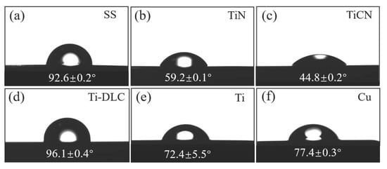 Water contact angle of (a) SS; (b) TiN; (c) TiCN; (d) Ti-DLC; (e) Ti; (f) Cu.