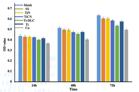 Figure 5 shows the absorbance OD values of the culture solution measured at 450 nm for each group at 24, 48, and 72 h of incubation. As shown in Figure 5, the cell counts measured in the SS and TiN groups were similar to those in the blank group for the three studied culture times. The TiN group had the highest number of viable cells and exhibited better biocompatibility than the other groups. The TiCN group had a slightly higher number of cells than the Ti group, especially at 72 h. This indicates that the growth of the cells on the surfaces of SS, TiN, and TiCN was not significantly inhibited and better cell proliferation was demonstrated. The number of cells on the Ti-DLC surface was significantly lower than that on the Ti surface, but much greater than that on the Cu surface.