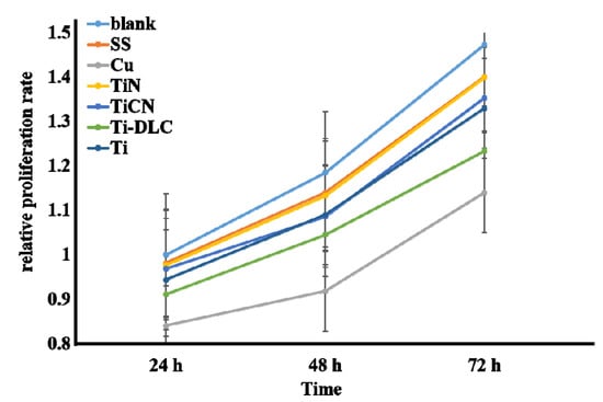 The cell proliferation rate is one of the key factors used to determine the biocompatibility of films. Figure 6 shows the relative cell proliferation rate of each sample cultured for 24, 48, and 72 h. Moreover, it is evident from the figure that the cell proliferation rate curves of the SS and TiN groups almost completely overlap. This indicates that there was no difference between the inhibitory effects of SS and TiN on the cells. The cell proliferation rate of the TiCN group was slightly lower than those of the SS and TiN groups. Among the three films, the Ti-DLC group exhibited the lowest cell proliferation rate. The TiN and TiCN groups have higher cell proliferation rates, possibly because they have lower surface roughness and a smaller water contact angle, which is favorable for cell adhesion and growth. The low cell multiplication rate for the Ti-DLC sample was mainly due to its high hydrophobicity. It has been experimentally demonstrated that as the water contact angle increases, the wettability of the material decreases, preventing the cells from attaching to its surface, swelling, and growing well. Eventually, the number of cells, proliferation rates, and differentiation levels are reduced [31].
