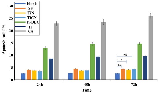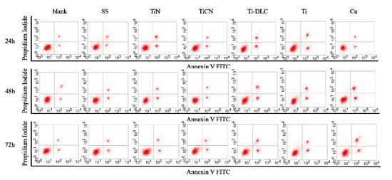 The apoptosis rates of the TiN and TiCN groups were similar at the three time points of 24, 48, and 72 h, and their apoptosis rates were the lowest among the experimental groups. Compared with the apoptosis rate at 24 h, the rate of the TiN film increased by 0.04% at 48 h and 0.69% and 72 h. In contrast, the apoptosis rates of the TiCN films tested at 48 and 72 h increased by 0.32% and 0.63%, respectively. The total apoptosis rate in the SS, TiN, and TiCN groups was less than 5% at all three time points. SS releases harmful ions and thus exhibits a higher rate of apoptosis than TiN and TiCN. TiN has a uniformly dense passivation film and good wettability, which are favorable for cell adhesion and multiplication. As a result, the TiN film exhibited lower apoptosis. Our previous studies have shown that TiC crystals enable TiCN films to exhibit higher corrosion resistance by blocking corrosive substances from penetrating the film path [11]. The high corrosion resistance and hydrophilicity of the TiCN film resulted in the lowest apoptosis rate.