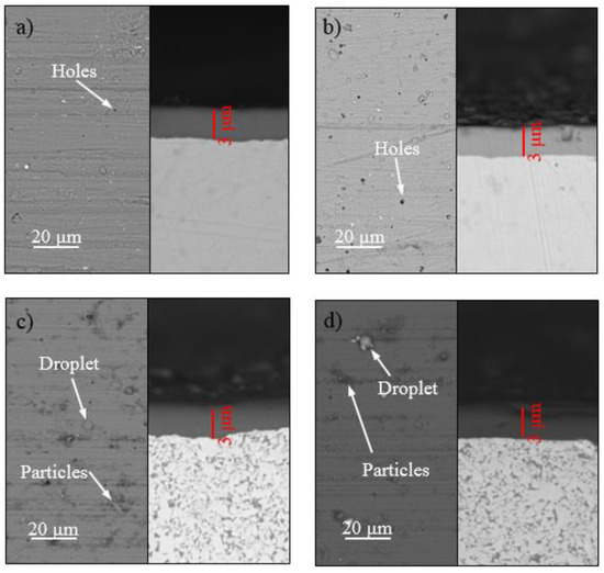 The scanning electron microscope (SEM) images of surfaces and cross-sections of the coated samples are shown in Figure 1. Both the CrN and AlTiN coatings had the similar thickness (around 3 µm) on the HSS and WC-Co. There were a few holes, particles and droplets on the coatings which did not affect the natural test and application of the coating.