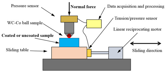 Reciprocating wear tests were conducted on a reciprocating sliding machine, as shown in Figure 2. A normal force was applied on the counter body (a WC-Co ball with a diameter of 6 mm; brand: YG8; Young’s modulus: 510 GPa; the hardness: around 1520 HV). The force was measured via a pressure sensor. The friction force was detected via a tension/pressure sensor. Data from the sensors were recorded to calculate the real-time coefficient of friction.