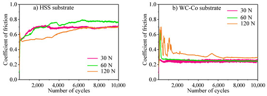 The CoFs as a function of cycle number on the uncoated HSS and WC-Co samples are shown in Figure 3. The stable CoF of HSS substrate was around 0.7–0.8, which was higher than the stable CoF of the WC-Co substrate (around 0.2–0.3). The normal forces had no obvious influence on the stable CoF of the uncoated samples.