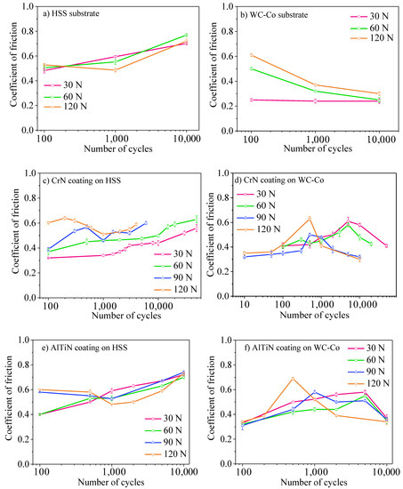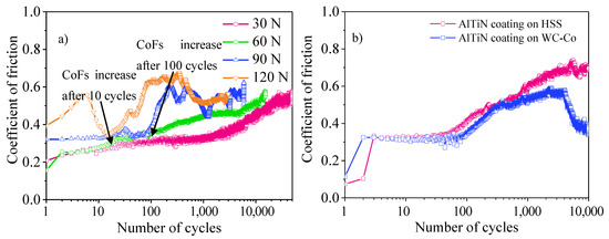 CoFs as a function of the number of cycles: (a) CrN coating on HSS substrate under different normal forces; (b) AlTiN coating on HSS and WC-Co substrates under 30 N normal force.