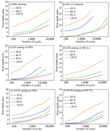 The wear depths of uncoated and coated samples (Figure 7) increased with the number of cycles and the normal forces. The wear depths of the coated samples (Figure 7c–f) were smaller than those of substrates (HSS and WC-Co substrate, Figure 7a,b). This means that the CrN and WC-Co coatings could improve the wear-resistance of the HSS and WC-Co substrates. The wear depth of the HSS substrate (Figure 7a) was larger than the wear depth of the WC-Co substrate (Figure 7b) because the hardness of WC-Co is higher than HSS (Table 2). Furthermore, the sharp increase in wear depth occurred earlier under the larger normal forces, which might be due to the rapid failure and removal of coatings.