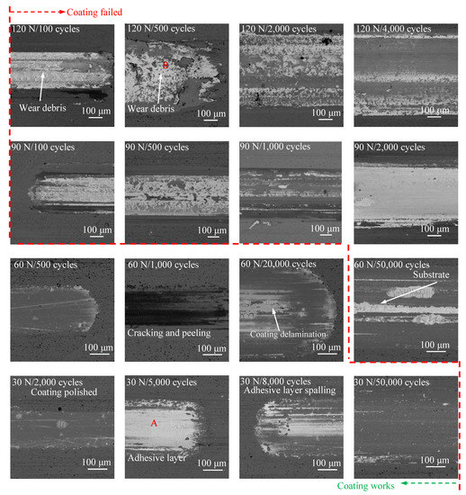 Under 60 N, the wear degree was higher than that under 30 N. The cracking and peeling of adhesive layer occurred after 1000 cycles. A small part of coating delaminated at the middle of the contact area after 20,000 cycles. After 50,000 cycles, the middle part of coating was removed, and there were furrows on the surface of the counter body (Figure 10).