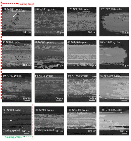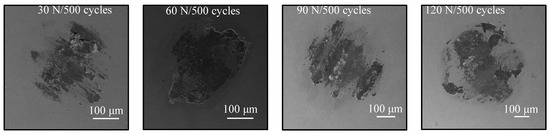 The wear process of the AlTiN coating on HSS is shown in Figure 13. The coating very easily failed under any load condition. Under 30 N, after 100 cycles, most of the coating still existed on the surface and only a small part of coating was spalled. After 500 cycles, the coating was completely removed. Under larger forces (60–120 N), the AlTiN coatings on the HSS substrate were totally removed very quickly (≤100 cycles), because the deformation of the HSS substrate accelerated the spallation of the AlTiN coating. The substrate material type played an important role in the wear and failure behaviors of AlTiN coating [9,34,41]. The AlTiN coating had poor binding properties to the HSS substrate compared with CrN coating, because the hardness difference between the AlTiN coating and HSS was large (Table 4), thus the AlTiN coated on HSS had poor capacity to withstand the normal force and friction force. Moreover, under different forces, the wear debris material was formed the counter body (Figure 14), as previously observed after the CrN coating failure.