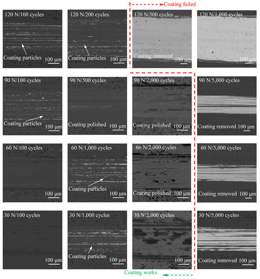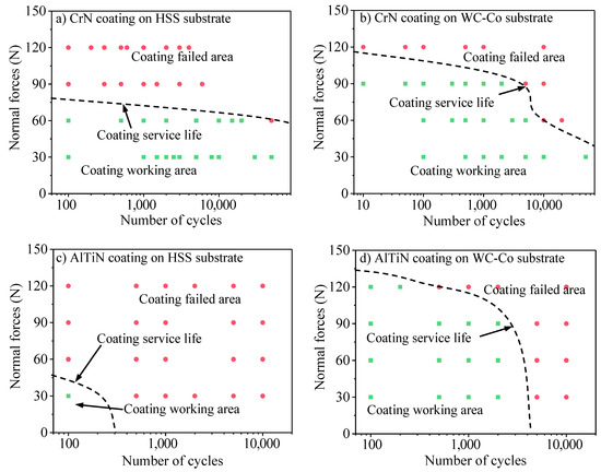Utilizing the comprehensive analysis of CoFs, wear depth and wear scar morphologies [36,42] can determine whether the coating has failed. Furthermore, the maps of coating service life under different normal forces could be drawn, as shown in Figure 17. The dotted curves between the coating working area and the failed area could be regarded as the service life of coatings. The wear progress of coatings could be divided into two stages, based on whether the coating failed or not: (1) the coating working stage, where the number of cycles was smaller than the service life. CoFs and wear depths were small (Figure 5 and Figure 7) and the coating was not or only partially removed; and (2) the coating failed the stage where the number of cycles was larger than the service life. CoFs tended to approach the CoFs of the substrates (Figure 5), wear depths were high and exceeded the thickness of coatings (Figure 7) and the coating had been almost totally removed.