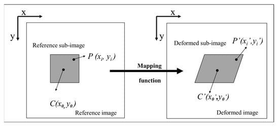 where and are the displacement of the center point C of the sub-image in the X- and Y-directions after deformation, respectively, and is the displacement gradient of the reference sub-image.