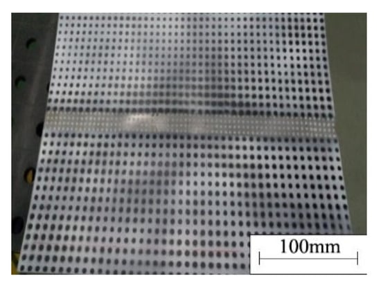 C-3 adhesive was used to prepare speckle in the weld and surrounding area. Sandblasting treatment was carried out in the weld area of the curved plate shooting surface to ensure that the area was not reflective, and then the covered leakage plate was affixed, and modulated C-3 glue was evenly smeared to prepare the weld area speckle. In the non-weld zone, white high-temperature paint was uniformly sprayed, the leakage plate was covered after drying, and black high-temperature paint was uniformly sprayed. Finally, the specimen with scattered spots shown in Figure 3 was made. The physical performance parameters of C-3 adhesive are shown in Table 1. Its good heat resistance can ensure that it is not burned and can effectively adhere to the surface of the workpiece.