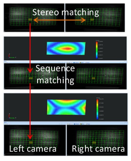 The camera taking pictures time and the welding process time were consistent. The camera model was Aca1600–20 gm; the camera resolution was 1626 pixels × 1236 pixels; the pixel size was 4.4 µm × 4.4 µm; the calibration plate field of view was 400 mm × 300 mm; and the camera acquisition frequency was set to 2 pictures per second during the welding process and 1 picture per second during the cooling process. After the welding was completed, the thin bending plate speckle image acquisition was stopped after cooling for 5 min. The dynamic speckle image captured by the camera was imported into the detection software for matching and displacement calculation, as shown in Figure 4. For the full-field grid division of the thin bending plate, the size of the sub-image was set as 30 pixels × 30 pixels, and the step length was 15 pixels × 15 pixels. Stereo matching was performed using the thermal correlation image captured around the same time, and sequence matching was performed using the thermal correlation image captured at different times.