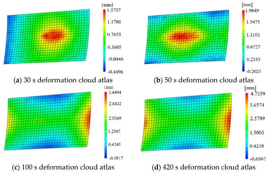 Out-of-plane deformation cloud atlas of the thin bending plate. (a) 30 s; (b) 60 s; (c) 100 s; (d) 420 s.