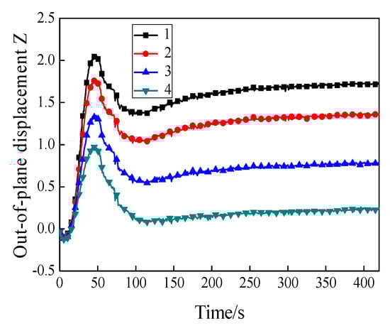 The out-of-plane dynamic deformation at the four key points (Figure 2) of the thin bending plate is shown in Figure 6. From the beginning of welding to 50 s, the deformation trend of each point was consistent. All the points underwent maximum deformation relatively quickly. The deformation rate of point 1 was the highest, and other key points decreased in turn. After 50 s, the deformation decreased gradually, but the deformation rate of the points was similar. After cooling (100 s), the deformation of the points was stable. The results showed that during the welding process, the weld bead and the nearby metal thermally expanded and were subjected to the pressure stress of the surrounding metal, making it rapidly convex along the z-direction. To coordinate the deformation of point 1, points 2, 3, and 4 also move in the same direction. The closer the point to the weld, the greater the temperature gradient and the more severe the deformation. Upon the completion of the welding (60 s), the thin bending plate began to cool, and the stress of the points gradually changed from compressive stress to tensile stress. However, the welding was not completed at 50 s, and the displacement of the points began to decrease, indicating that point 1 moved farther away from the heat source and the cooling rate accelerated, making the tensile stress exceed the compressive stress and reducing the deformation. After 50 s, a large temperature gradient was observed at the points; thus, the deformation of the test plate was still high at the beginning of cooling. With the decrease in the temperature, the temperature gradient of the weld and its surroundings decreased. Furthermore, carbon steel has a greater elastic modulus at low temperatures; thus, the out-of-plane deformation gradually stabilizes.