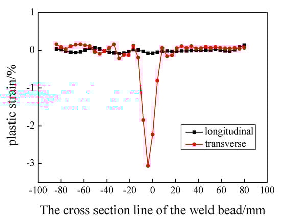 The longitudinal and transverse strain distribution on the cross-sectional line of the welding bead after TIG welding and cooling of the thin bending plate is shown in Figure 7. The longitudinal strain on the cross-sectional line of the weld bead was near zero, indicating that the longitudinal plastic deformation on the cross-sectional line of the bending plate weld was small. The transverse plastic strain was negative in the weld area, indicating that the shrinkage deformation occurred after the weld cooling, and the compressive plastic strain was the highest at the center of the weld. In the area adjacent to the weld, the negative plastic strain gradually decreased and transited to positive strain. Therefore, the welding plastic region of the thin plate includes the negative compressive plastic strain region and the positive tensile plastic strain region.