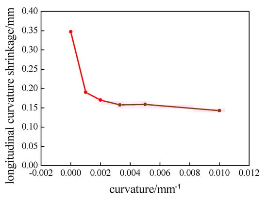 The relationship between the longitudinal shrinkage and the curvature of the thin bending plate is illustrated in Figure 8; the longitudinal shrinkage of the thin bending plate with curvature was found to be smaller than that of the flat plate, and the weld shrinkage was only 0.15–0.2 mm indicating that under the same welding and design parameters, the initial transverse curvature has little effect on the longitudinal shrinkage under longitudinal convex welding.