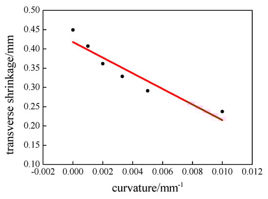 The transverse shrinkage in thin bending plate welds is caused by the transverse shrinkage force, which is not only related to the welding process and material properties but also to the cross-section size, material stiffness, and constraint of the test plate. The larger the curvature of the bending plate, the greater the material stiffness and the constraint between the matrix, and the smaller the transverse shrinkage force and the transverse shrinkage. The welding position has little effect on the transverse shrinkage of the bending plate, whereas the effect of curvature is relatively large. The relationship between the transverse shrinkage of the weld and the curvature of the thin bending plate is shown in Figure 9. The fitting of the transverse curvature and the transverse shrinkage of the weld is linear, as can be noted from the following expression: