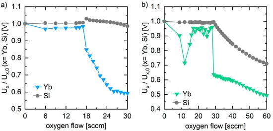 Discharge behaviour of the Yb and Si target plotted as ratio of the actual voltage to the initial voltage w/o reactive gas during the successive increase in oxygen flow at a total pressure of 4 × 10−3 mbar; (a) represents a power ratio that targets the YbDS composition; (b) represents a power ratio that targets the YbMS composition.