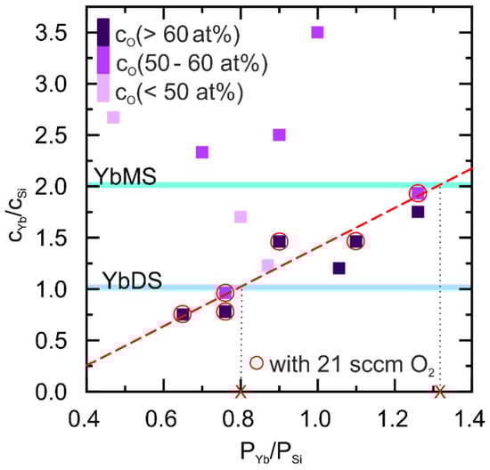 Parameter selection with different oxygen flow rates represented by the cation ratio of Yb and Si (measured by EDS) as a function of the power ratio of Yb and Si. The green line represents the YbMS cation ratio; the blue line represents the YbDS cation ratio. Each run is represented by the square symbol, where the cYb/cSi ratio was analysed and the oxygen concentration was measured and colour coded. The red circles around the squares represent the parameters with a 21 sccm O2 flow rate, while all other points were achieved using a 5 sccm to 29 sccm O2 flow rate. The dotted line is a linear fit of the results using 21 sccm O2. The red crosses indicate the right target power ratio for the YbDS and YbMS coating.