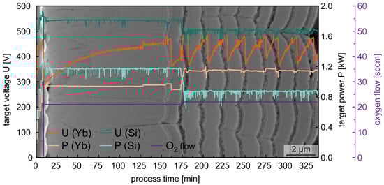 In Figure 3, the final deposition process was represented with the corresponding as-coated microstructure. The YbDS layer was sputtered first for 175 min and was represented with a straight Si voltage line with minor arcing. The Yb voltage slowly increased from about 300 V to 450 V, where it suddenly dropped to about 100 V. At around 175 min, the process was changed into sputtering YbMS, which can be seen by the change in both target powers. The YbMS process showed arcing of the Si target combined with a rhythmic poisoning of the Yb target, which represented the fast decrease in voltage. Beforehand, the Yb target voltage increased shortly, while right after, the Si target voltage dropped before running constant again. Due to the longer deposition times in comparison to the initial screening experiments, the chosen process parameters were not stable but especially the Yb voltage fluctuated, indicating an ongoing change between transition and metallic mode or oxidic mode and back. The oxygen flow was increased slightly from 21 sccm at the YbDS to 22 sccm for the YbMS to keep the chamber pressure stable. The underlying microstructure shows clearly the impact of the Yb target voltage change within the YbMS coating.