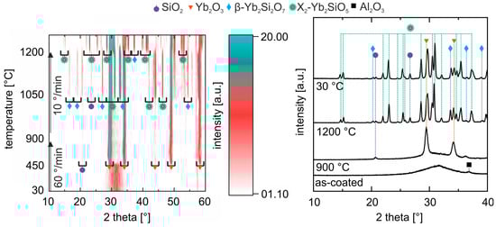 The produced Yb-silicate coatings were X-ray amorphous, which required a post-crystallisation treatment. In order to understand the mechanisms of the crystallisation and the phase formation, HT-XRD was executed simulating the crystallisation treatment of the Yb-silicates deposited on an Al2O3 substrate. The parameters of the heat treatment were derived from the graded Mo-Si plus Si oxidation protection layers and were applied here as well for comparison. All samples except the ones measured in HT-XRD were annealed in a box furnace for 1 h at 900 °C followed by 1 h at 1200 °C, which was followed by cooling down to room temperature.