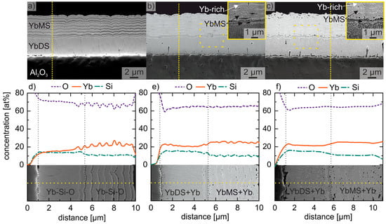 The resulting microstructure of the Yb-silicate coatings on the inert substrate, Al2O3, are represented in Figure 5 using SEM and the EDS line scans. In Figure 3, the as-coated state showed a columnar but dense amorphous YbDS layer until the Yb target reached its highest voltage of about 450 V at around 160 min. At this point, the contrast became lighter, see Figure 5a, which indicates a high Yb content and a lower oxygen content, as shown in the EDS scan (Figure 5d). The amorphous YbDS layer in Figure 5a presented a slightly higher Yb concentration compared to silicon especially shortly before switching to YbMS. These findings were directly linked to the process data in Figure 3. During the deposition of the YbMS, high-voltage peaks of the Yb target are responsible for the layered structure. The Yb-rich microlayers are not as dense, which is why they are partly washed away during preparation. In the amorphous YbMS layer, recurring high Yb concentrations were measured accompanied by oxygen and silicon decreases (Figure 5d). After crystallisation, the YbDS layer formed a homogenous two-phase microstructure of YbDS and most likely YbMS (Figure 5b). In the YbMS layer, the thin, Yb-rich layer was again visible in a lighter greyscale due to a material contrast. Moreover, pore formation started especially within the Yb-rich regions of the YbMS layer. The cation ratio Yb to Si in the YbDS layer was about 1.5 and in the YbMS, it was 2.4 overall. The ratio depended highly on the location because of the two-phase microstructures of both layers (Figure 5e). After 10 h at 1200 °C, the YbDS coating remained a dense, two-phase microstructure with possibly YbMS precipitates (Figure 5c). The YbMS coating was still split into multilayers of YbMS of about 480 nm and Yb-rich thin layers of about 150 nm. The pore formation increased at the interface region between YbDS and YbMS as well as at the surface of the dual-layer coating. Furthermore, the pores seemed to increase in size in comparison to after crystallisation. The linescan in Figure 5f showed no differences compared to the crystallised coatings. The oxygen content was stable already after crystallisation at about 65 at %.