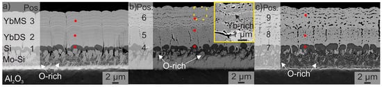 By implementing the Yb-silicates on top of the bond coat consisting of a 5 µm thick graded Mo-Si layer with a 1 µm thick Si top layer, the four-layered EBC coating system was created. The morphology changed compared to the Yb-silicates directly on the inert substrate due to different surface roughness. Although the EBC coating system was deposited on the same substrate, the bond coat created a different surface roughness for the Yb-silicates to build up on. The finger-like structure of the bond coat predesigned the columns for the YbDS. In Figure 5a, with a smooth surface, no columns could be found in the Yb-silicates, while in Figure 6a, the columns run mostly through until the surface. The phase composition matched almost perfectly the YbDS and YbMS composition, as shown in Table 1. After crystallisation, the columnar structure led to pore formation along the gaps vertically in the YbDS. At the same time, the Yb-rich microlayer within the YbMS created horizontal pore chains. Compared to Figure 5b, fewer Yb-rich precipitates in the YbMS layer and no second phase in the YbDS layer were detected. Since the composition in Figure 6b is closer to the stoichiometric YbDS and YbMS (Table 1), the Yb may have largely dissolved into the phases. Whether the effect is driven by the bond coat or due to a different sputter run cannot be determined at this point. After 10 h of oxidation (Figure 6c), a heavier pore formation could be found compared to Figure 5c. Nevertheless, the phases remained stable, and no change in composition could be detected (Table 1). The rough surface of the bond coat applied by conventional DC magnetron sputtering led to columnar gaps and thus increased the pore formation of the Yb-silicates compared to the direct deposition on the Al2O3 substrate with a low surface roughness in Figure 5.