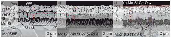 In the last step of this study, the four-layered EBC system was applied on three Mo-Si-based alloys. After the post-crystallisation process, the EBC system was tested for 10 h and 100 h at 1200 °C and for 100 h at 800 °C in air. The micrographs of the cross-sections presented an excellent adhesion of the coating system on top of the different alloys after 10 h (Figure 8). The two Yb-silicates coating developed stable YbDS and YbMS phases, which were identifiable up to 100 h of oxidation (Table 2). The EBC system on the Mo-Si-based alloys showed the same heavy pore formation due to the surface roughness in the µm range initiated by the bond coat as seen on the inert Al2O3 substrate. Yb-rich phases were hardly found, and only the horizontal pore chains remained in the YbMS layer, which are due to the process instability. On the Mo-9Si-8B and Mo-12.5Si-8.5B-27.5Ti-2Fe alloys in Figure 8a,b, Mo was traceable within the Si/SiO2 but not within the Yb-silicates (Table 2). This suggests that Mo either did not diffuse through the Yb-silicates or diffused only in small untraceable amounts. On the Mo-12.5Si-8.5B-27.5Ti-2Fe, neither Fe nor Ti were able to diffuse into the Yb-silicate layers after 10 h. In Figure 8c, on the Mo-21Si-34Ti-0.5B, TiO2 formed between the bond coat and YbDS layer, showing that the EBC system silicates cannot provide a full oxidation protection, which is a consequence of the porosity and the oxygen diffusivity through the Yb-silicate. Moreover, Figure 8c shows the formation of a thin oxide layer on top of the YbMS containing traces of Mo, indicating that Mo from the substrate alloy or the bond coat diffused through the EBC system to the surface. In previous studies, without the Yb-silicate layers, the higher Ti content of the Mo-21Si-34Ti-0.5B alloy compared to the other alloys used and the difference in microstructure enabled Ti to diffuse fast and build TiO2 rapidly [].