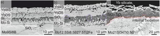 After 100 h of oxidation at 1200 °C, the EBC system on the Mo-9Si-8B still shows great oxidation protection and adhesion (Figure 8a). The Si layer of the bond coat transformed mostly into SiO2. Compared to the 10 h of testing, the EBC system did not show further pore formation. On top of the Mo-12.5Si-8.5B-27.5Ti-2Fe, SiO2 and TiO2 formed between the bond coat and YbDS (Figure 8b). The YbDS layer itself seemed denser compared to the oxidation test for 10 h. However, the two Yb-silicate layers were less distinguishable compared to Figure 7. The EBC coating system could not protect the Mo-21Si-34Ti-0.5B alloy after 100 h against oxidation (Figure 8c). The Yb-silicate coatings were still visible but disrupted. A SiO2-TiO2 mixed oxide layer grew on the surface of the alloy.