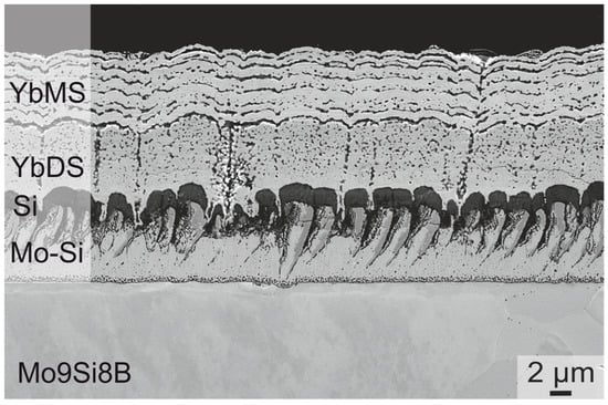 The four-layered EBC system was also tested on the three alloys at 800 °C for 100 h in air. The EBC system was able protect every alloy successfully at this temperature. In Figure 9, the result of the oxidation test was presented for the Mo-9Si-8B alloy representative because this alloy is the most prone to show the pesting phenomenon. The adhesion of the EBC system to the alloy was intact. All four layers were clearly identifiable. As seen in the figures above, the Yb-silicates developed pores in the YbDS layer vertically along the columnar gaps and in the YbMS layer horizontally with the Yb-rich microlayers. By comparing the morphology, Figure 9 seemed to be closely related to Figure 6b, where the micrograph after crystallisation was presented.