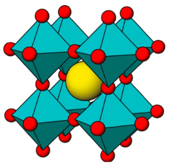 The nomenclature for any material that has the same crystal structure as calcium titanate (CaTiO3) is ‘perovskite’ []. Perovskite consists of a crystalline structure with composition ABX3, in general A and B are cations and X is oxygen or a halogen anion. The crystal structure of perovskite is pictured in Figure 1.