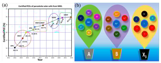 (a) Certified PCEs of perovskite solar cells achieved by different groups, data collected from NREL website on 30 March 2022. (b) Schematic diagram of ABX3 perovskite with possible A-and B-site (cations) and X-site (anions) dopant passivators (middle circles in blue color indicate the widely used composition of ABX3 PSCs). Reproduced with permission from ref [].
