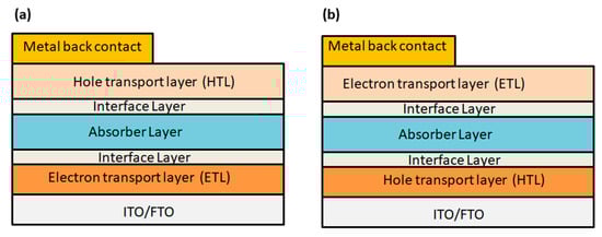 The device structure of PSCs basically contains an absorber layer, an electron transport layer (ETL), a hole transport layer (HTL), a transparent conductive oxide (anode) and a metal contact (cathode). The incident light enters through the transparent conductive oxide (FTO or ITO) towards the perovskite absorber layer. The schematic of the device structure in both nip structure and pin structure is shown in Figure 3a,b, respectively. The absorber layer upon absorption of the incident radiation creates electron and hole pairs. These generated electrons and holes are transported via ETL and HTL, respectively, towards the external circuit with the help of charge collecting contacts. The material to be used in ETL and HTL must have the required band alignment with respect to the absorber layer to ensure proper carrier collection [,]. In order to obtain the best possible performance from the PSC, all three layers of materials must be wisely selected and fabricated. Roy et al. [], demonstrated the role of layer thickness and carrier concentration requirement for all three layers. They revealed that the optimum transport layer (both ETL and HTL) thickness must be as minimum as possible until it ensures proper film coverage across the perovskite layer. The optimum absorber layer thickness is equivalent to the carrier diffusion length of the perovskite. Roy et al. [] further explained the role and requirement of the energy level tuning across the perovskite/HTL and ETL/perovskite interfaces.