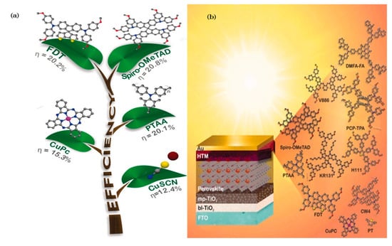 (a) The efficiency improvement tree of perovskite solar cell using different hole transporting layers. (b) Device architecture and molecular structure of commonly used hole transporting materials. Reproduced with permission from ref [].