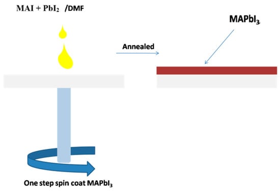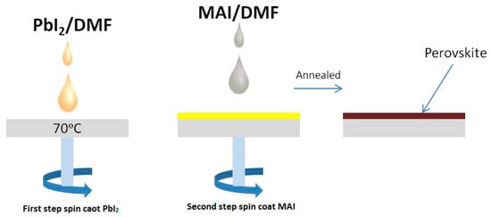 The most common and cost-effective method of synthesizing the perovskite film is solution processing. This can either be through a one-step method or a two-step sequential method. The one-step method involves the spin-coating of a pre-mixed solution that is typically prepared by blending CH3NH3X powder with PbX2 in a 1:1 molar ratio. The two-step sequential method first spin-coats PbI2 over a TiO2 substrate before being dipped in a CH3NH3X solution []. This method allows perovskite to be more effectively implemented into the substrate’s mesoporous layer. Although the two-step method has produced solar cells with higher PCEs to date, the one-step is preferred []. Figure 5 and Figure 6 depict the schematic illustration of one-step and two-step solution processing techniques, respectively. This method is less complex and allows superior control of the crystallinity and morphology. Therefore, this technique provides the potential to control the grain growth and hence achieve a much higher PCE in the future.