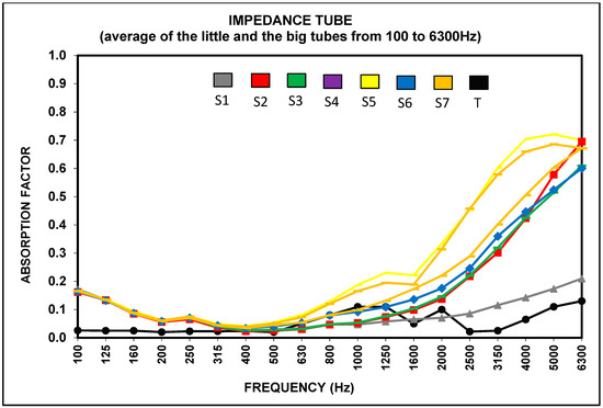 In the relevant literature, researchers have found that higher sound transmission loss occurred at higher frequencies for PP needle-punched nonwovens [35]. In the present study, a similar result was obtained: the NP fabric had a slightly higher absorption factor after 5000 Hz frequency (Figure 2).