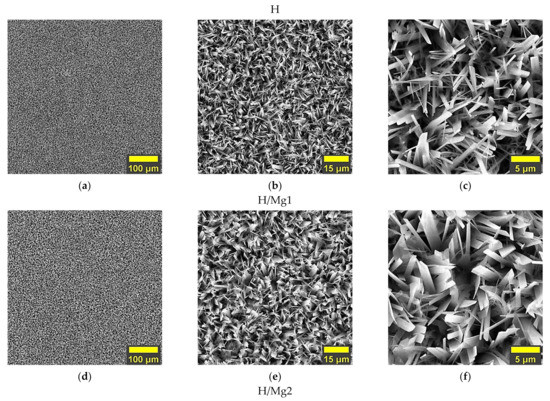 The addition of Mg in different concentrations into the HAp-based coatings altered the dimensions of the ribbon-like crystals as follows. For the H/Mg1 coatings, the ribbon-like crystals became wider and thicker (Figure 2f), which by increment of the Mg content in the case of H/Mg2 coatings led to the formation of a coating which appears to be denser (Figure 2i) compared to other two types of coatings with crystals that tend to resemble those of the undoped HAp (Figure 2c). Thus, based on these morphological observations, it can be stated that the Mg concentration influences the morphology and the crystal density of the HAp-based coatings.