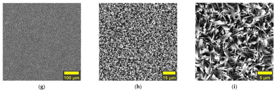 The morphology of the HAp-based coatings undoped and doped with Mg electrochemically deposited on the nanostructured surface present a morphology (Figure 2a–i) that consists of ribbon-like crystals that cover the entire surface exposed to the electrolyte during the electrochemical deposition.