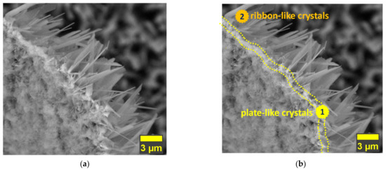 In terms of the growth mechanism of the HAp-based coatings obtained by electrochemical deposition, Figure 3 shows that the coatings consist of two layers of different morphologies. The first layer, which was formed within the first period of the deposition, is more compact and is not very thick, being constituted from plate-like crystals, while the second one is made of ribbon-like crystals, highly elongated along the c-axis.